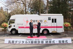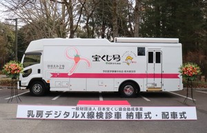 最新鋭の乳房デジタルⅩ線装置を搭載した検診車が2月24日(火)、予防医学事業中央会栃木県支部(公益財団法人栃木県保健衛生事業団)に配備されました。この検診車は一般財団法人日本宝くじ協会(東京都千代田区)が実施する社会貢献広報事業の助成を受け、公益財団法人予防医学事業中央会(同新宿区)が整備し、同支部に配車されたものです。